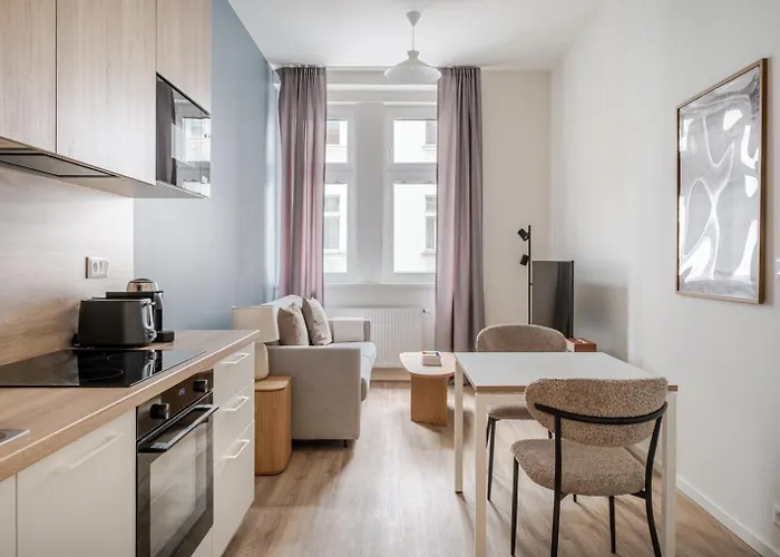 Pełnowymiarowa kuchnia posiada piekarnik i zmywarkę do naczyń. Spacer do stacji metra Vltavska zajmuje 10 min piechotą.